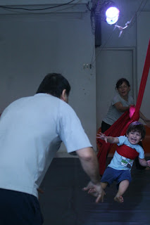 This workshop offers a space of play between mother and child from the basics of floor and aerial acrobatics. Moving on hands, suspended and swinging on webs and traps, climbing mother's body, roll and roll over on large balls are some ideas to enjoy this workshop.
