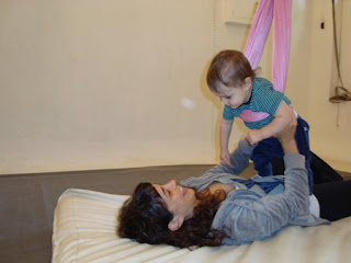 This workshop proposes a physical game space between mom / dad and baby. Suspended and swinging on webs, climb the mother's body, roll and roll over on large balls are some ideas to enjoy this workshop. The aim is to strengthen the bond between parent and baby through body language. Using as support elements such as balls, cloth, rollers and ramps to allow the dyad to connect from a different place and go progressively towards notions minimum floor and aerial acrobatics. The workshop is small groups (up to 5 babies) to accompany the individual processes and the needs of both parents and children. * For infants from 8 to 18 months.