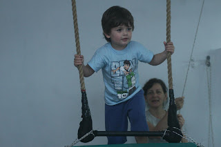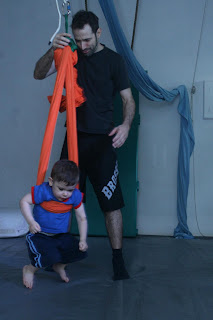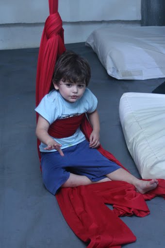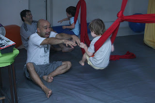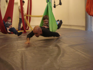 This workshop offers a space of play between mother and child from the basics of floor and aerial acrobatics. Moving on hands, suspended and swinging on webs and traps, climbing mother's body, roll and roll over on large balls are some ideas to enjoy this workshop.
